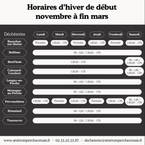 A partir du 3 novembre jusqu’à fin mars, les déchèteries seront ouverte aux horaires suivantes