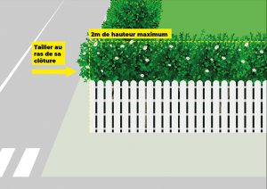 Taille des haies : Les haies situées le long du domaine public doivent être taillées régulièrement et leur hauteur ne doit pas dépasser 2 mètres.